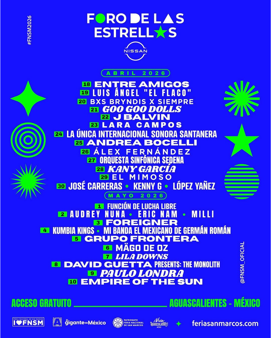 La Feria Nacional de San Marcos 2026 ya reveló uno de los carteles musicales más potentes de los últimos años y confirma por qué Aguascalientes se convierte cada primavera en el epicentro del entretenimiento en México. Durante tres semanas, el Foro de las Estrellas ofrecerá conciertos gratuitos, con figuras internacionales, grandes nombres de la música mexicana y propuestas para todos los gustos.
